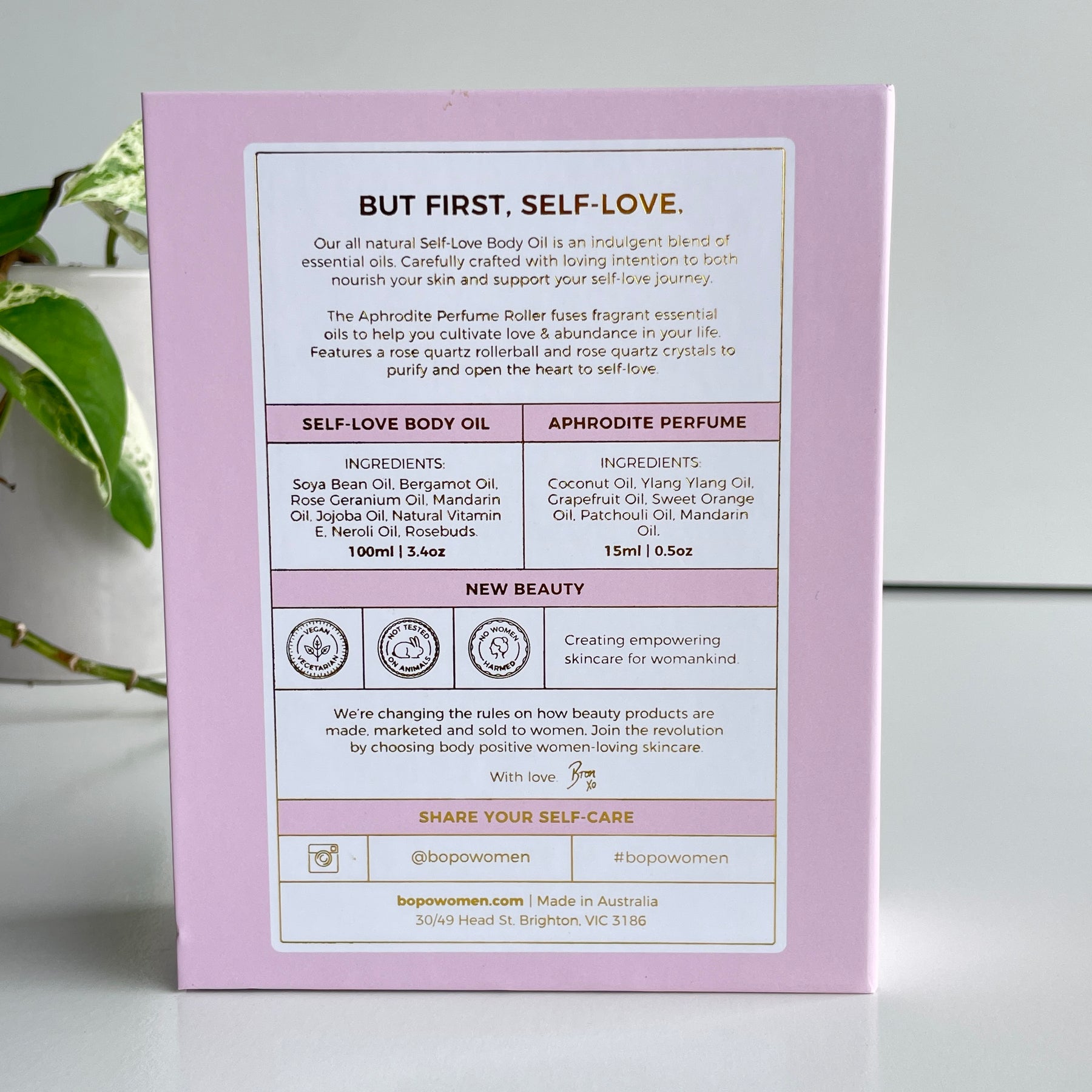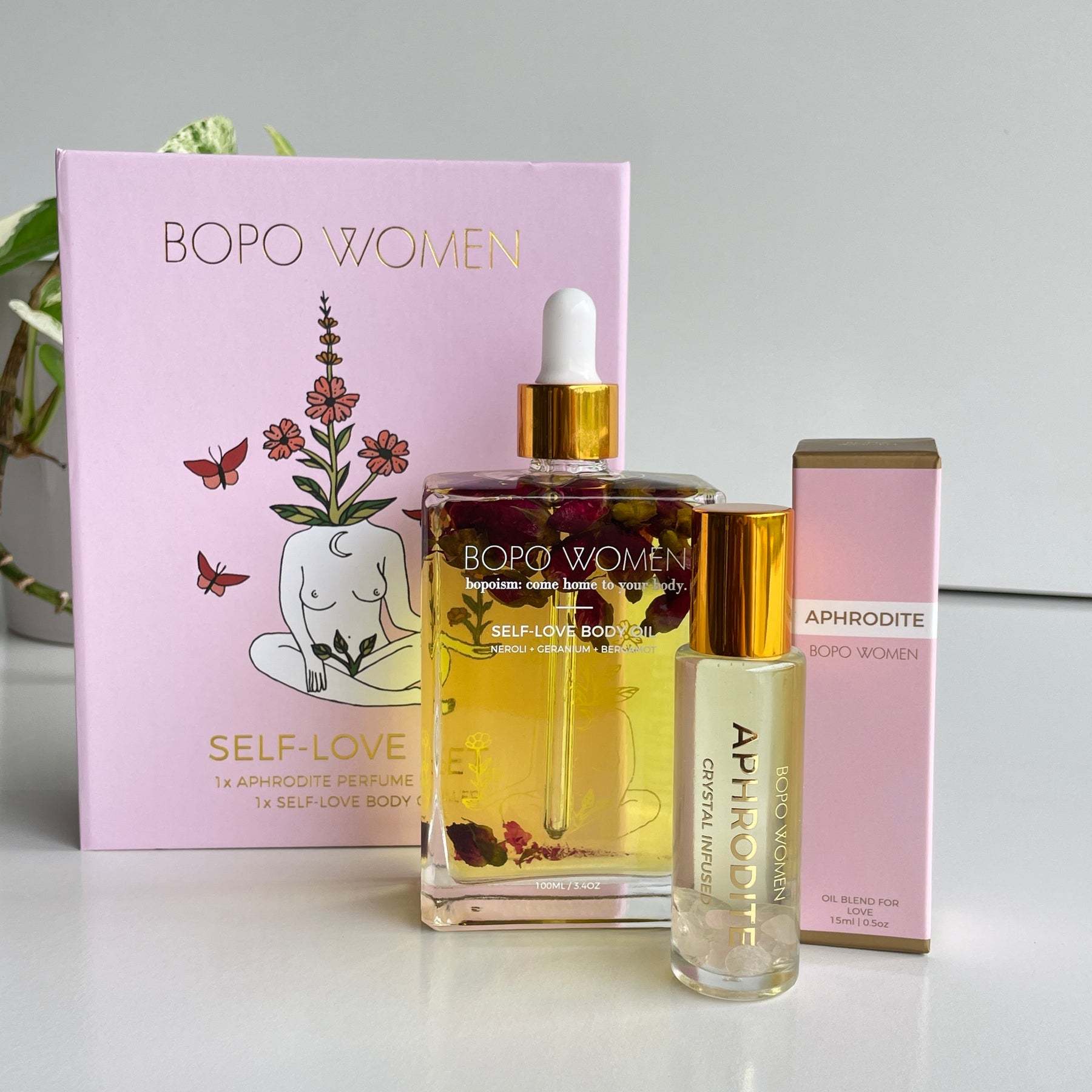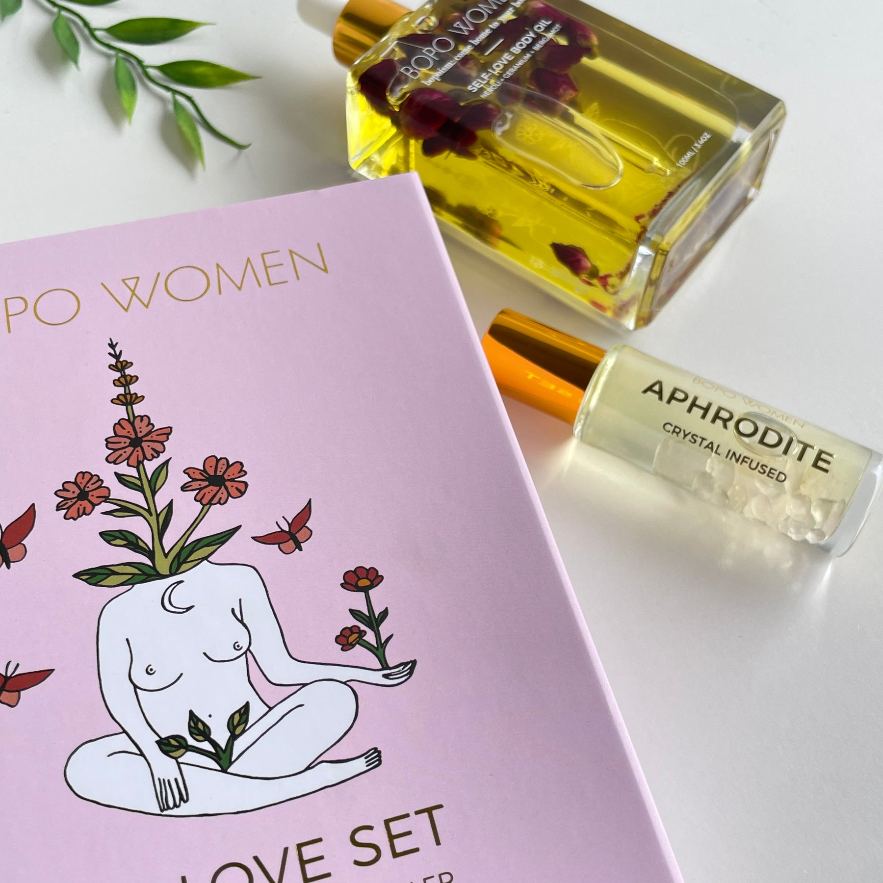 This gift set arrives in a beautiful gift box and features our Self-Love Body Oil and our Aphrodite Crystal Infused Essential Oil Roller. Self-Love Body Oil: combines geranium, bergamot, mandarin & neroli essential oils to infuse your skin with vitamins, fatty acids and antioxidants. It is suited to all skin types, is fast absorbing and can also be used in the bath and on hair ends. Aphrodite Crystal Infused Oil Roller: a crystal infused essential oil blend to cultivate love & abundance in your life. Perfect as a light natural perfume alternative. Combines the heavenly ylang ylang with grapefruit oil, sweet orange oil, patchouli and mandarin oil to create a feminine blend fit for a goddess. Features a Rose Quartz rollerball.