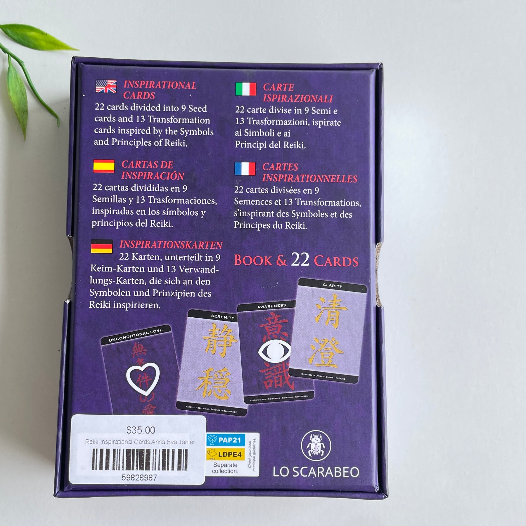 Reiki is a simple energy practice that promotes profound, natural healing on all levels of our existence: physical, emotional, and spiritual. A powerful catalyst for personal growth and healing, the Reiki Inspirational Cards will speak to your soul. Designed by Reiki master and practitioner Anna Eva Jahier, the deck applies Reiki principles to color, number and symbol correspondences from time-honored systems such as the Kabbalah, Tarot, and angelic healing. Nine seed cards offer clarification of the energies of the present moment, while thirteen transformation cards offer direction to inspire you and guide you on your path. Find a peaceful place within yourself, deal constructively with challenges, and become more appreciative of life when you invite Reiki energy and wisdom into your life with this transformative tool.The companion booklets for most Lo Scarabeo decks are in five languages: English, Spanish, French, Italian, and German.