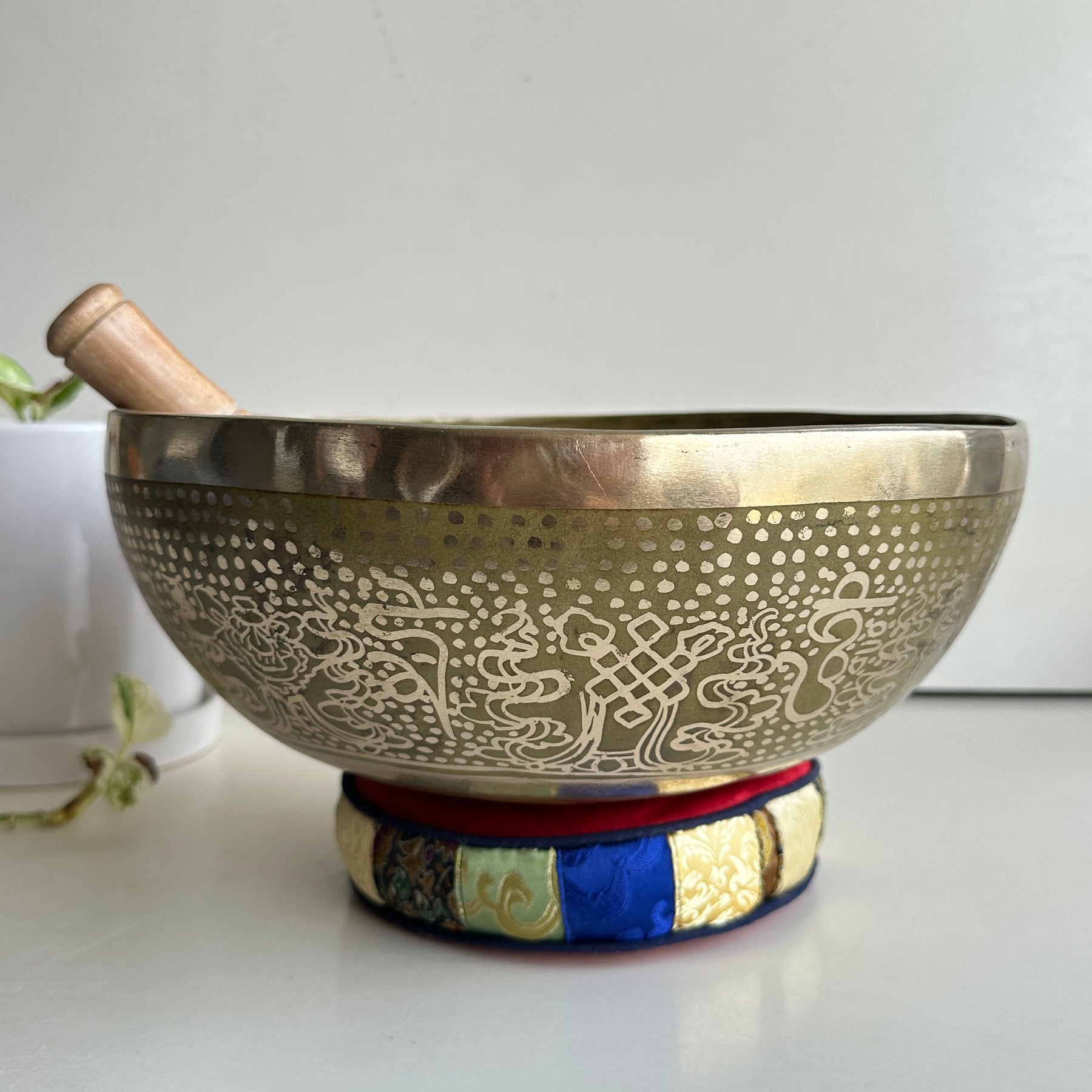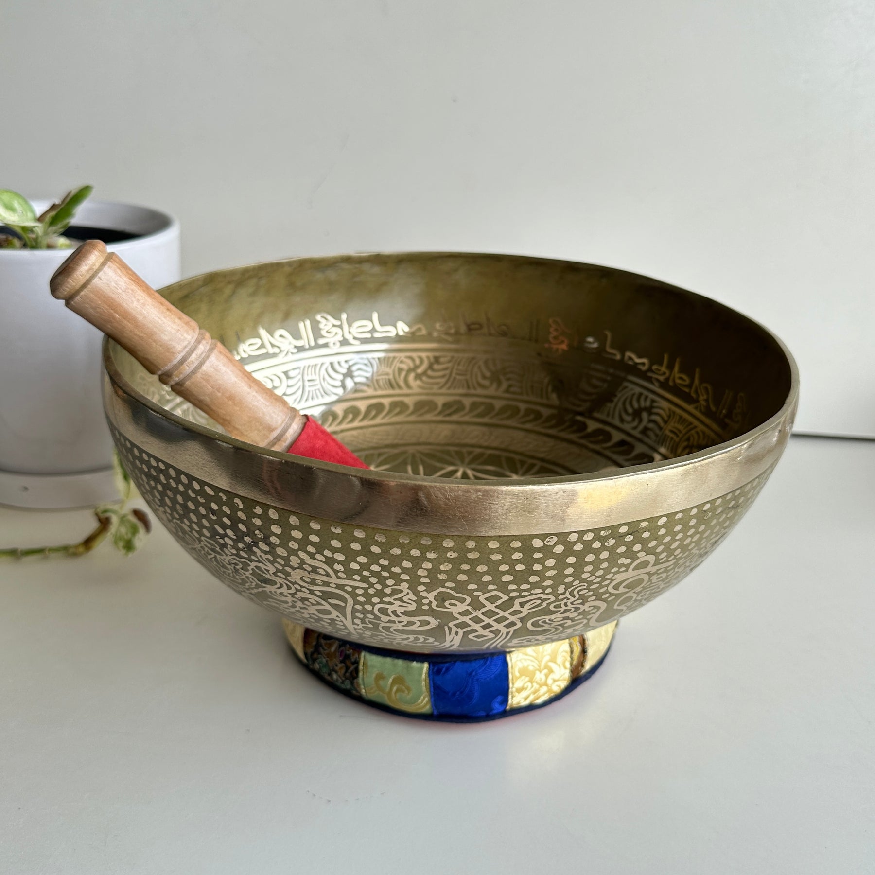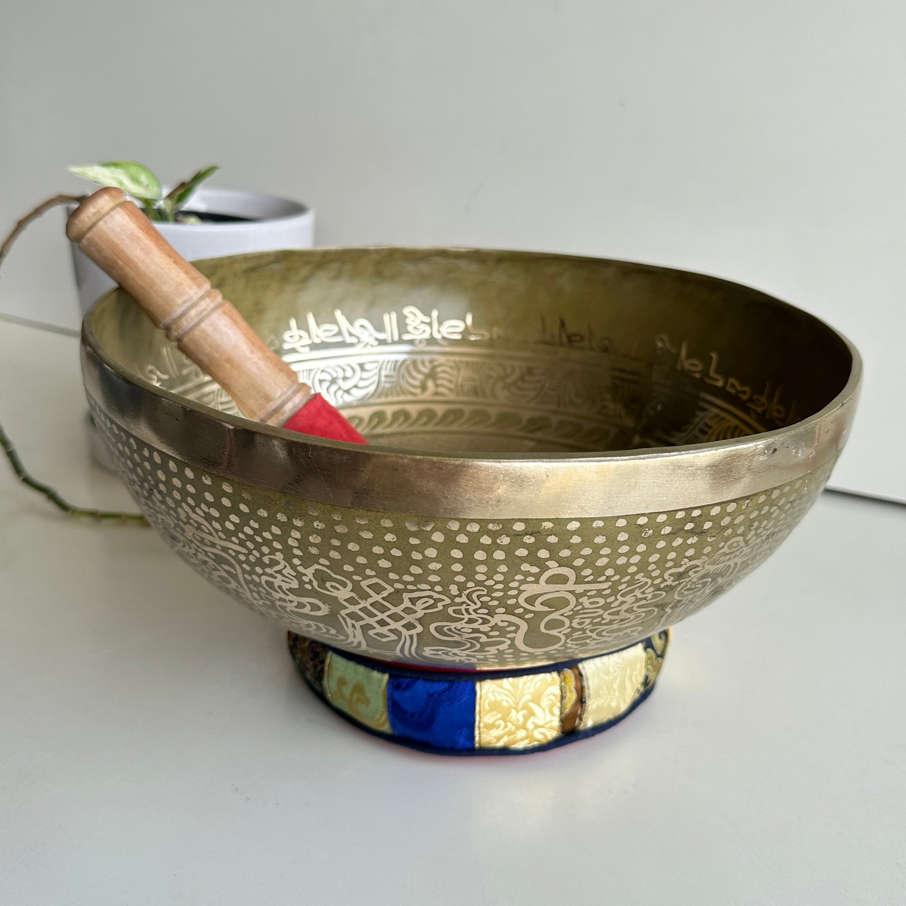 To create the soothing sound with a singing bowl, firmly press the accompanying mallet in the circular motion against the bowl’s outer edge or rim. When you start hearing a bright, clear tone, you can slow down the motion.