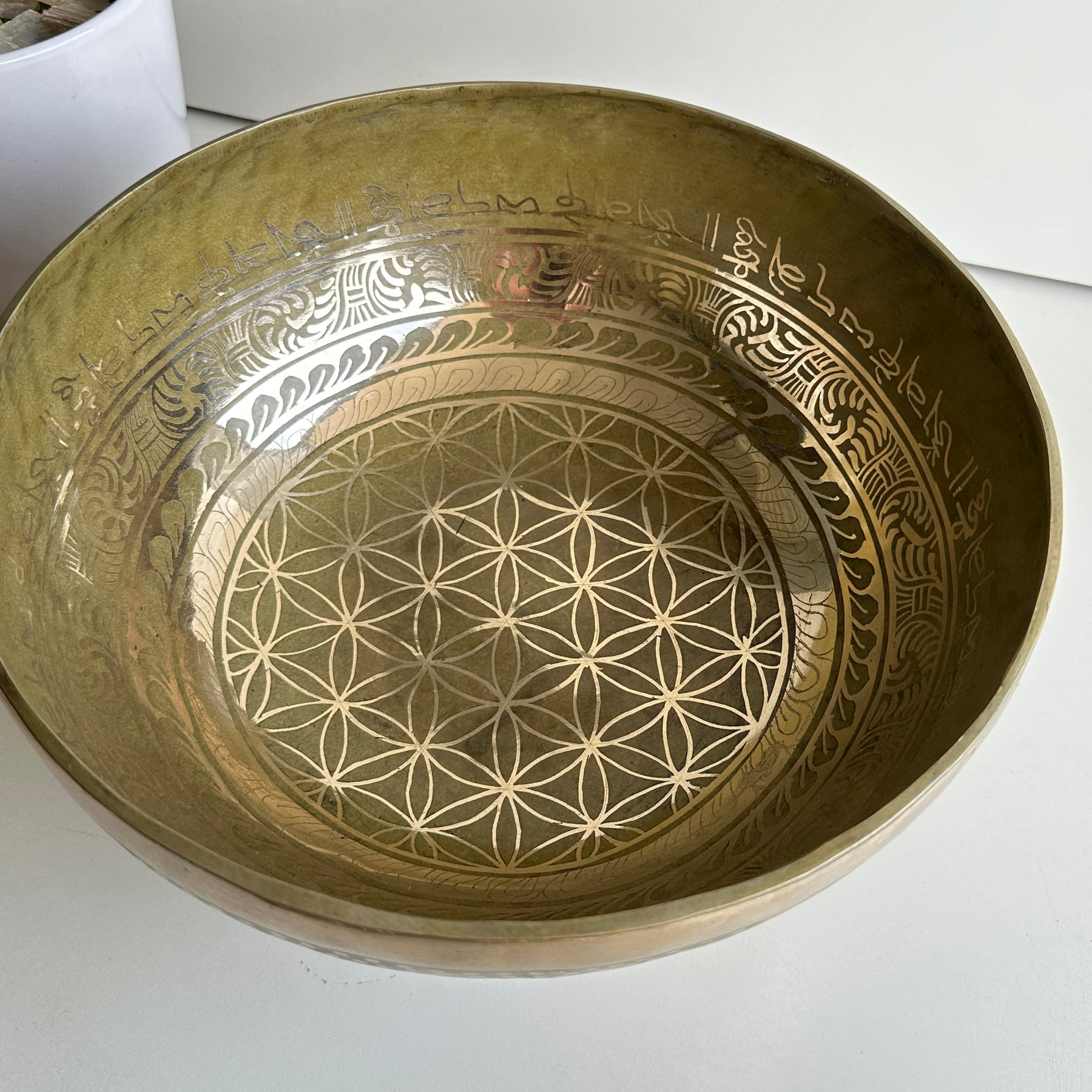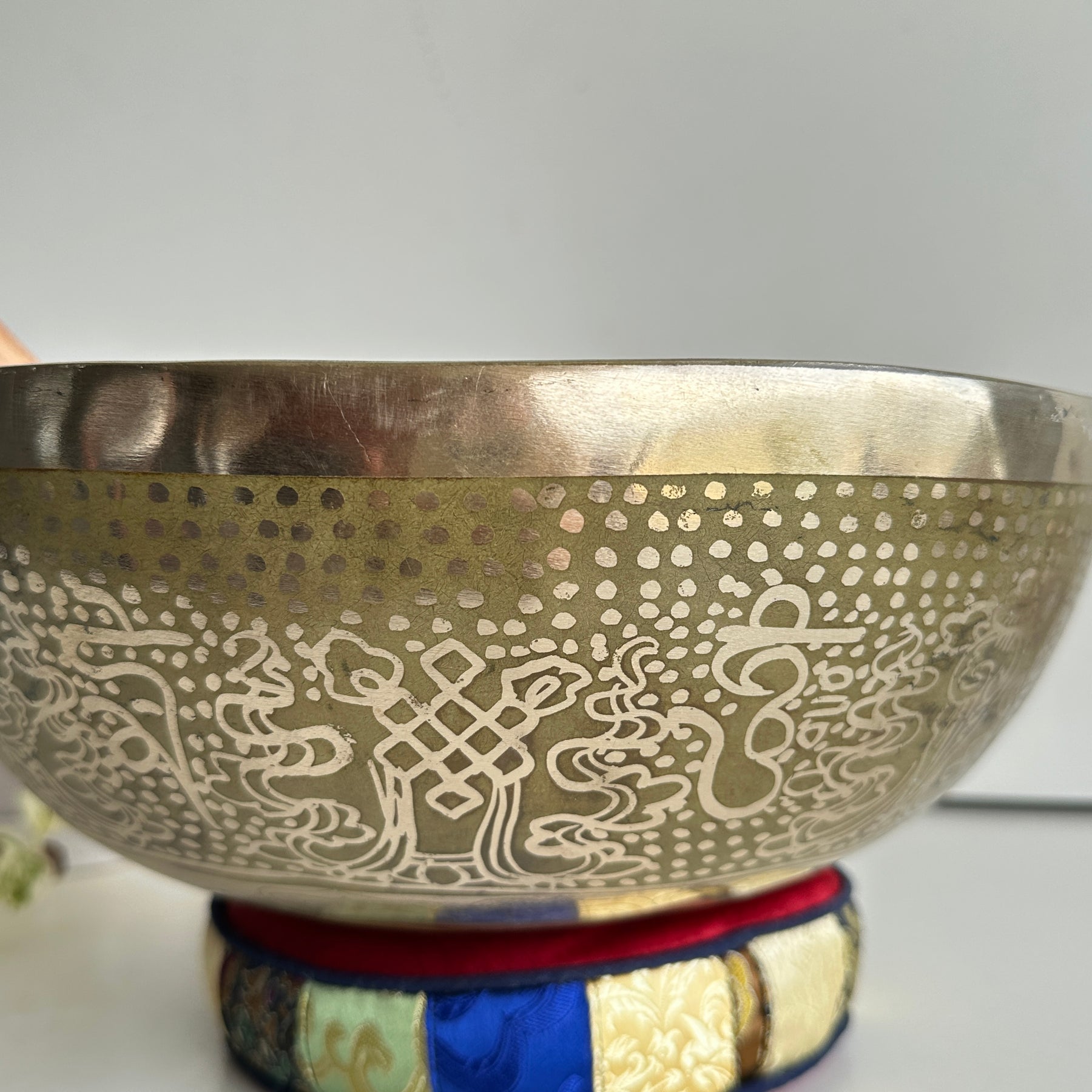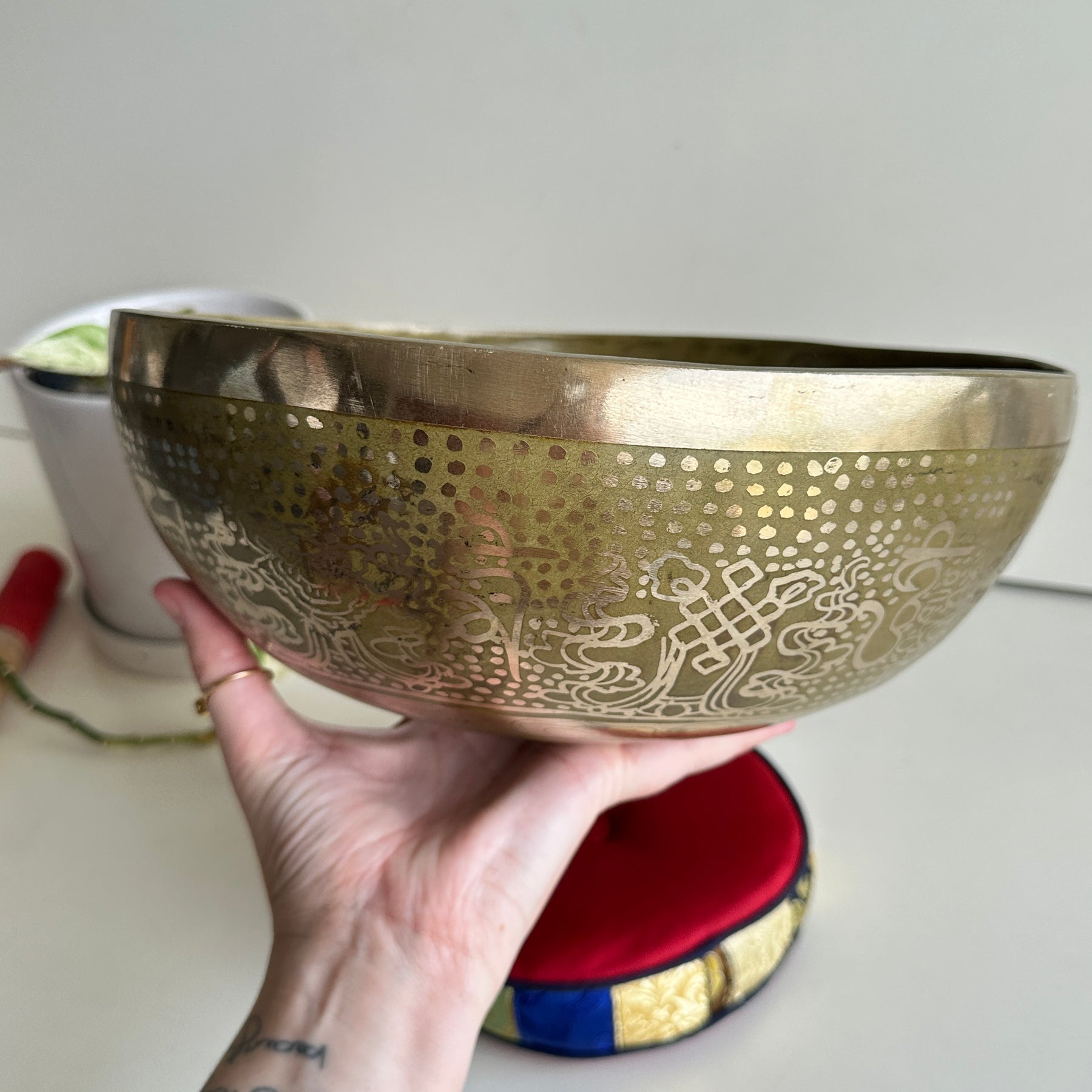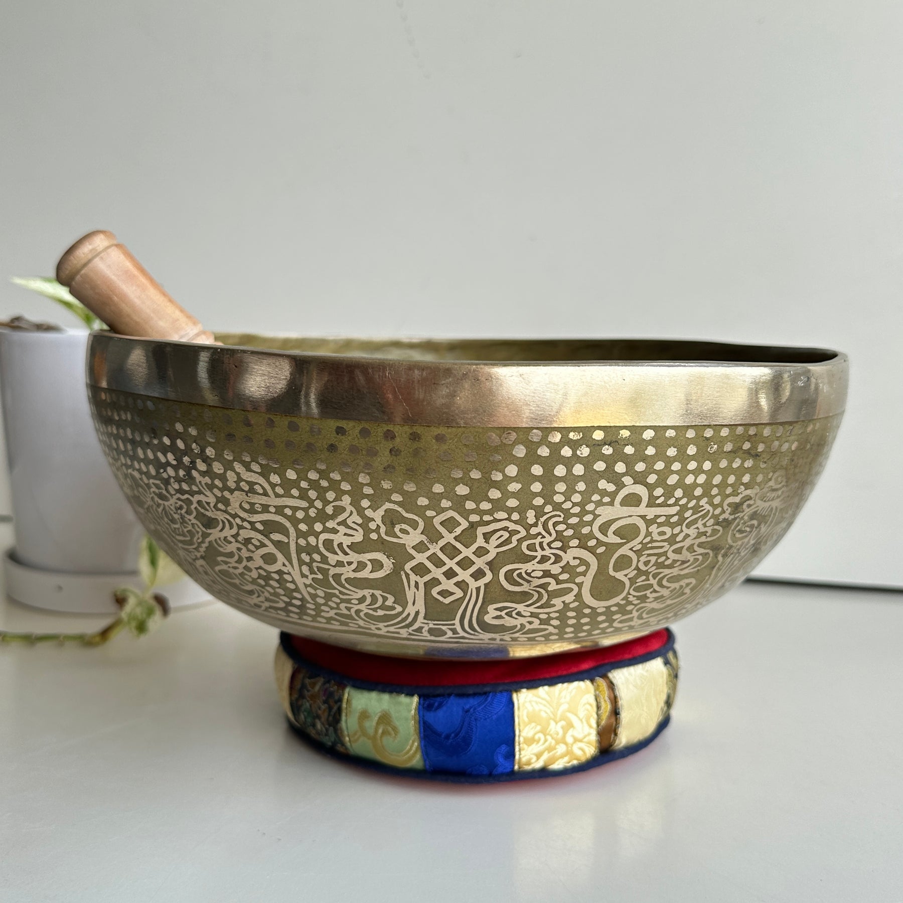 To create the soothing sound with a singing bowl, firmly press the accompanying mallet in the circular motion against the bowl’s outer edge or rim. When you start hearing a bright, clear tone, you can slow down the motion.